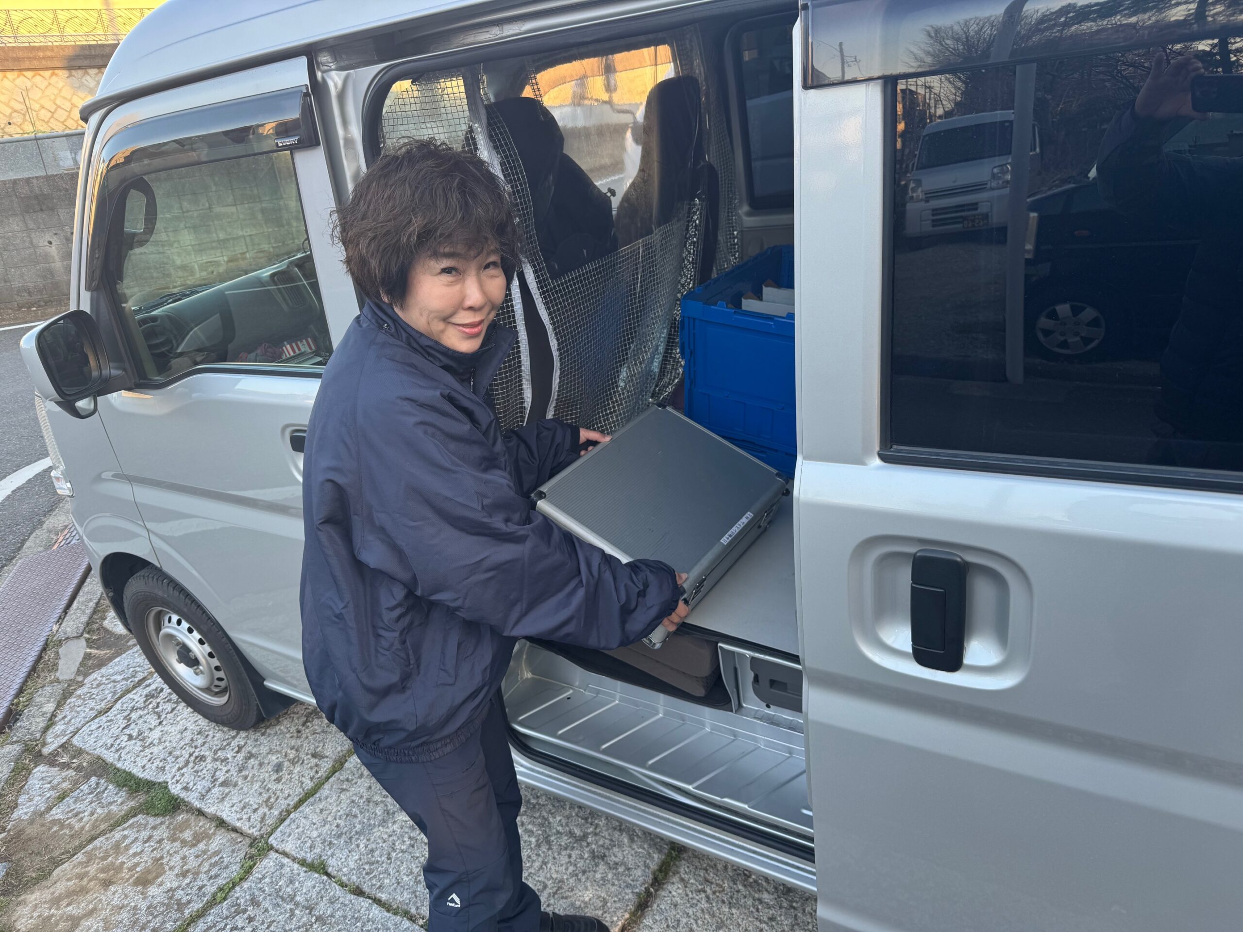 軽貨物車両もセキュリティ製品の配送。主に1t車がルート、又は固定エリアの巡回に対し、軽貨物車両はその隙間を埋めるエリアを担当します。例えば、1t車の業務で同エリア内で時間が重なる納品先があった場合などに、いずれかを受け持ち配送します。